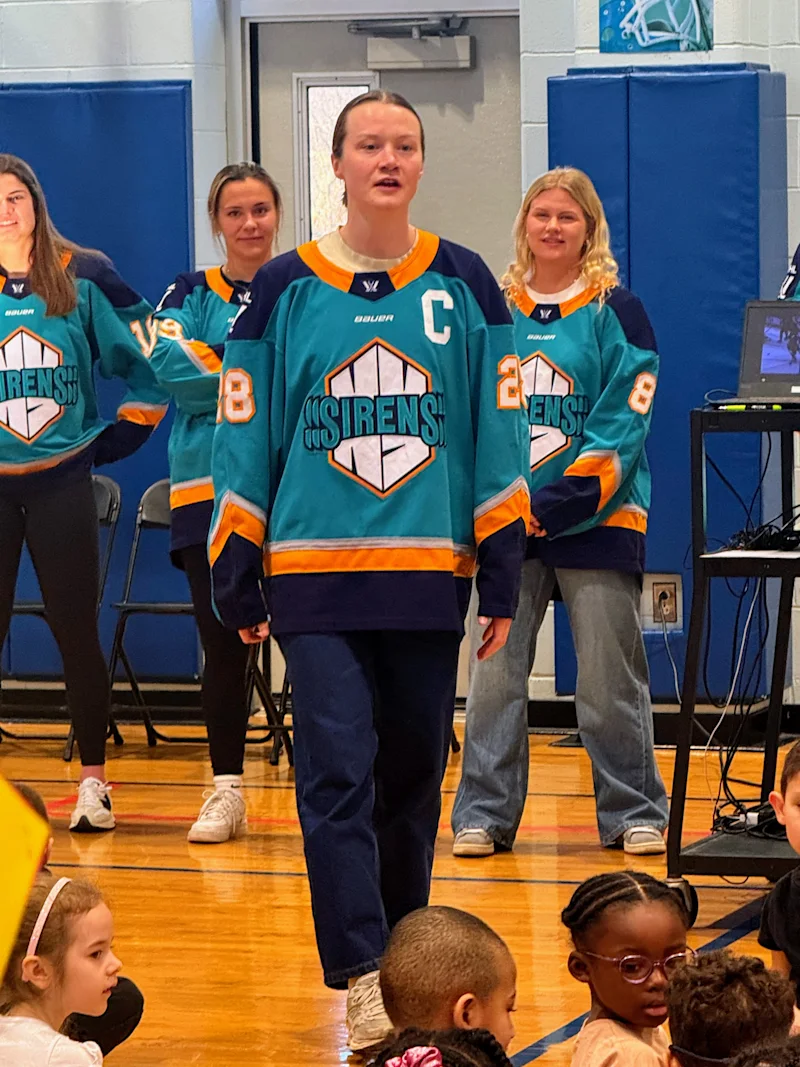 Following a question-and-answer period, the Sirens played a “shoot the puck” game with students featuring a hockey stick and ball, with prizes awarded to all participants.